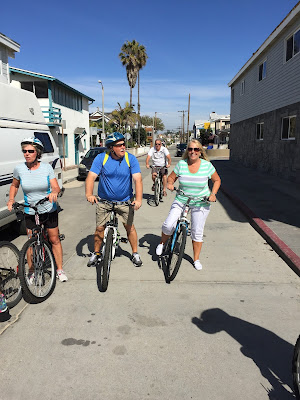 Another fun thing we did was go to Balboa Park to ride bicycles along the boardwalk. We did this with a few new friends we met at the Park, Dave and Sherry and Grant and Thea, and our friends Barry and Kathy. John had to rent a bike since his got stolen, so you can see he is having fun with this old time bicycle!